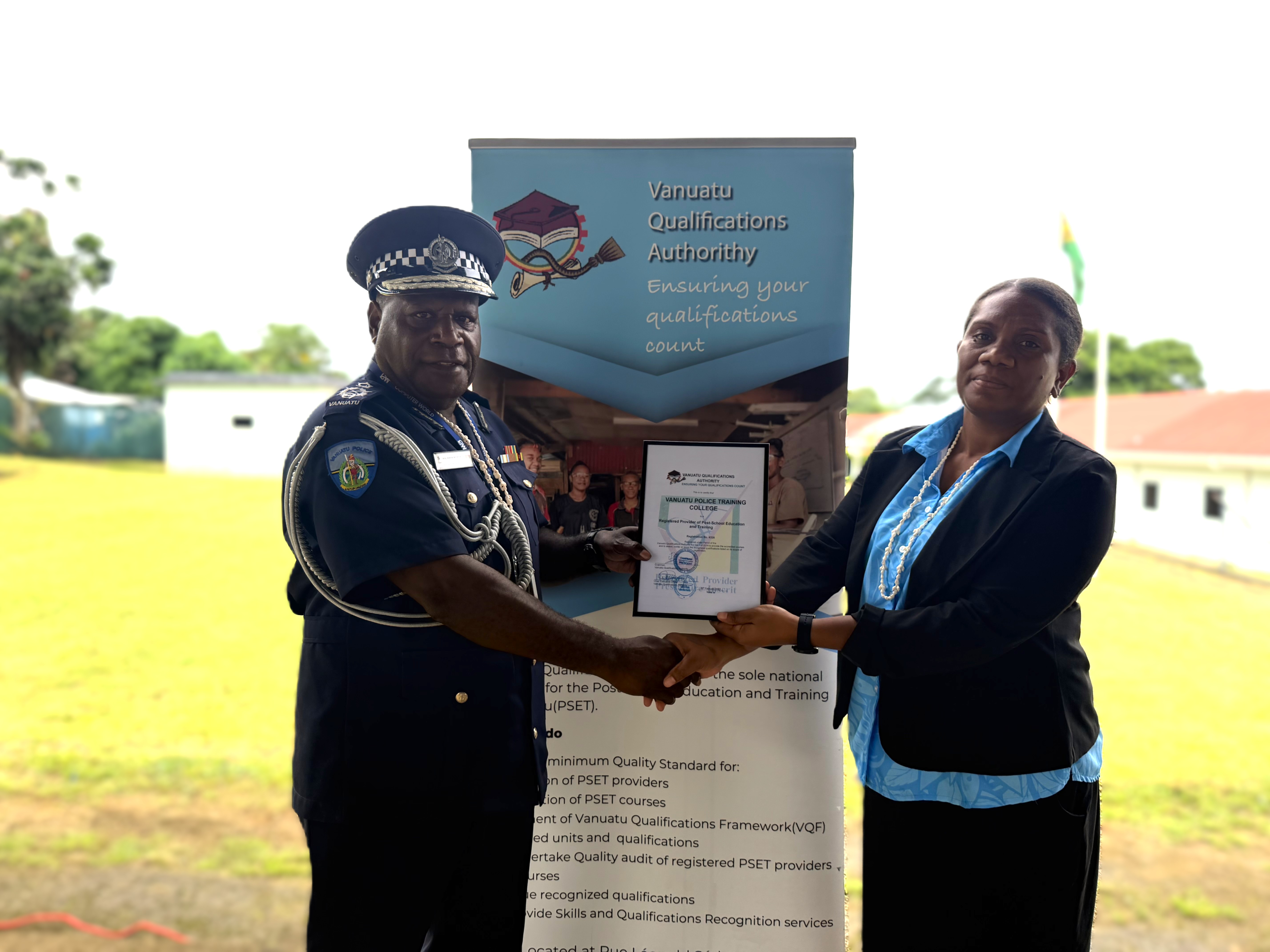 The Vanuatu Qualifications Authority (VQA) today officially handed over the renewed Certificate of Registration to the Vanuatu Police Training College (VPTC) during a formal ceremony held at the College campus today. The renewal was approved by the VQA Board on 25 February 2026 and is valid for a period of three (3) years, authorising VPTC to continue delivering formal police training programmes in accordance with national education and training standards.